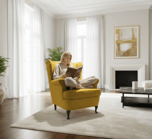 fotel-uszak-zolta-tkanina-lifestyle-z-kobieta-w-salonie